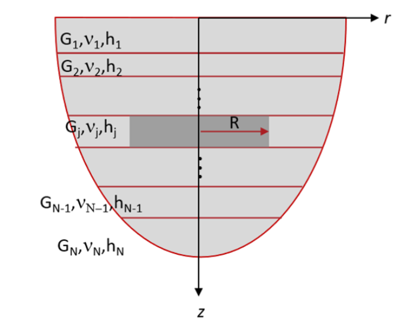 Vertically transverse isotropic (VTI) subsurface model consisting of N layers and subjected to fluid-induced constant pore pressure p(r, z) (darker-shaded) of radius R in an n-th layer. Note r, Vs, Vst, Vp, Vpt, and h are mass density, radial/horizontal and vertical S-wave velocities, radial/horizontal and vertical P-wave velocities, and layer thickness, respectively. Axisymmetric coordinates (r, z) are used and z-positive is upwards.