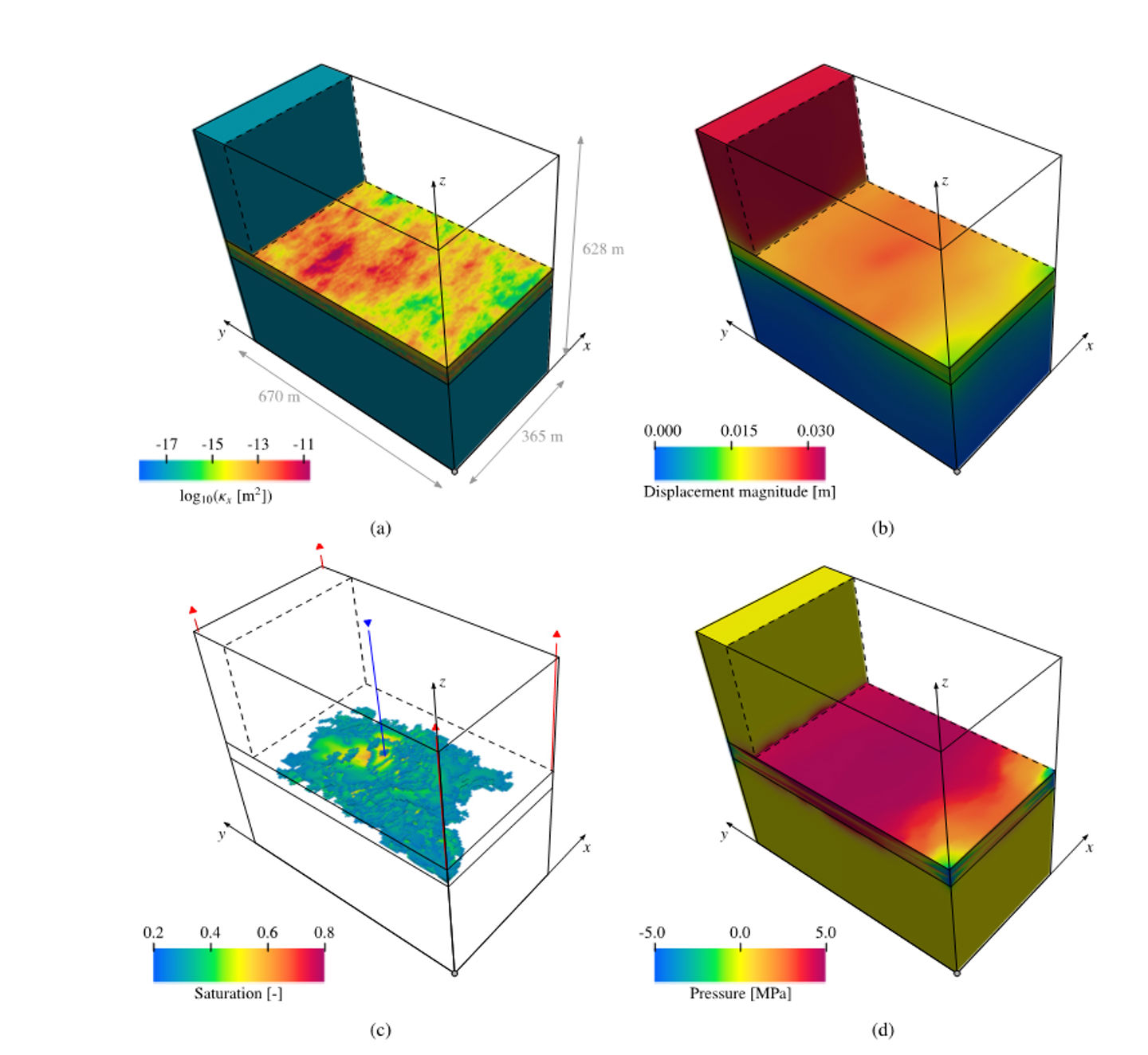 Example: SPE10-based benchmark. Sketch of the simulated domain and horizontal permeability field (a). Snapshots of the simulation results at t = 98 days (b, c, d). Note that in (c) injection and production wells are indicated in blue and red, respectively.
